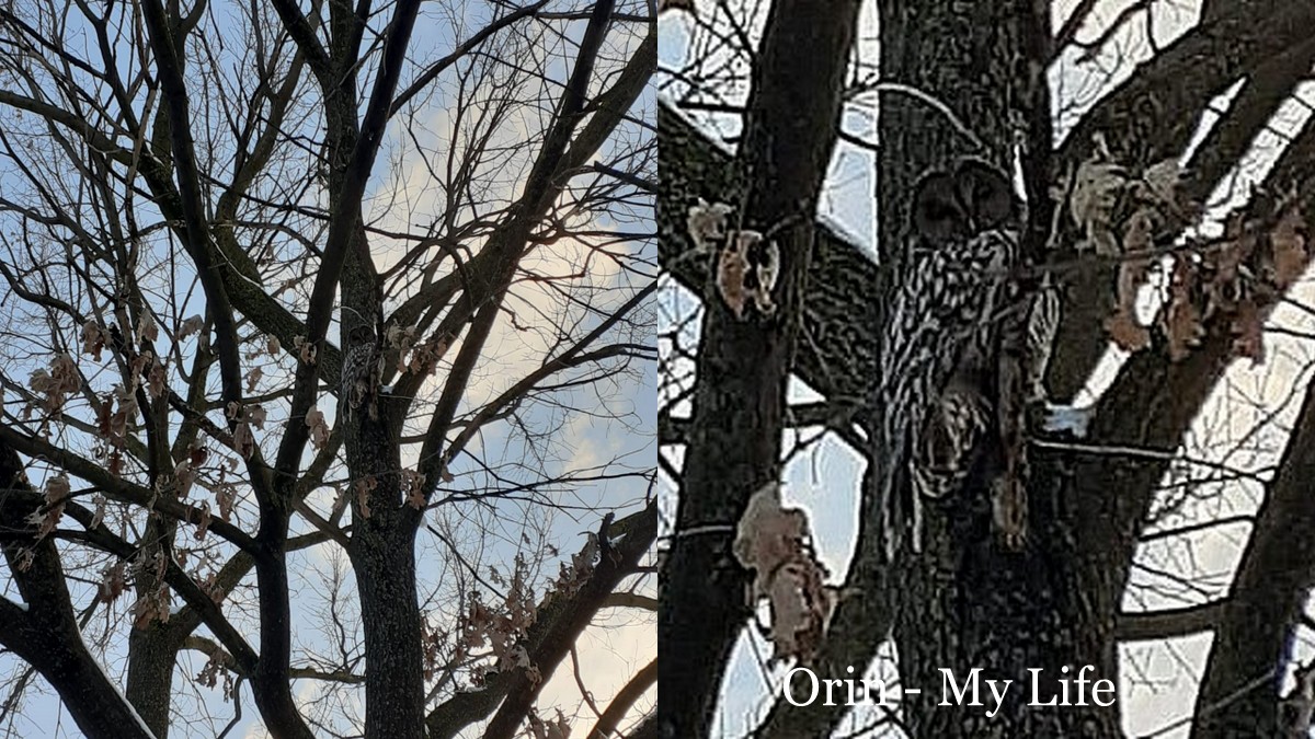 Următoarea premieră nu am fotografiat-o eu, îmi pare rău că nu am văzut-o! Maia era cu bunicii acasă și cumva a văzut bufnița atât de bine camuflată în stejar. Bunicul ei a fotografiat-o. Mai văzusem câte o mică cucuvea pe casa vecinilor dar bufniță doar în pădurea Dumbrava.